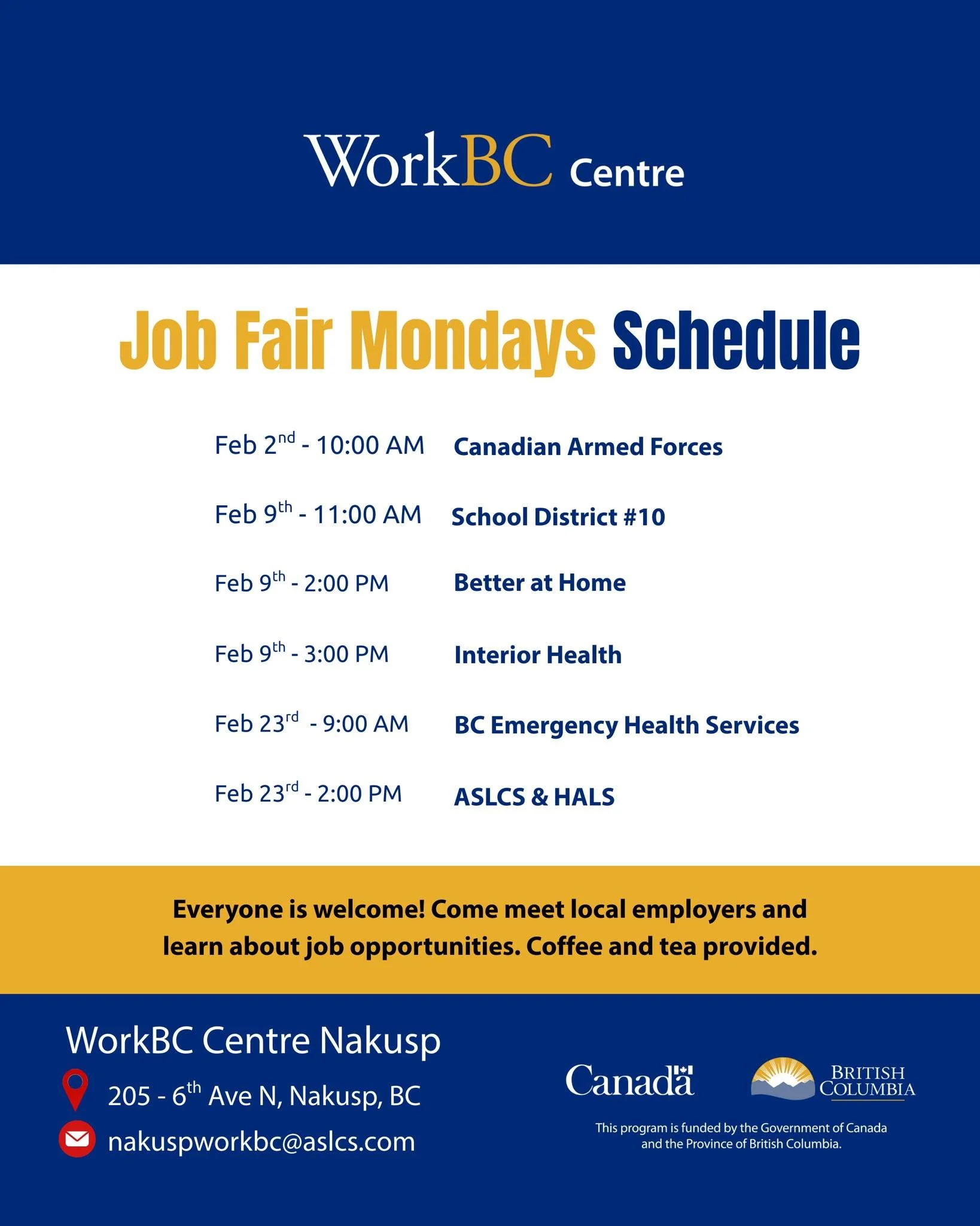 Join WorkBC Nakusp every Monday to hear directly from employers, learn about their hiring processes, and ask questions in a relaxed, supportive environment. WorkBC Nakusp staff will be there to help with questions about resources available. This is a free event, and coffee and tea will be provided.